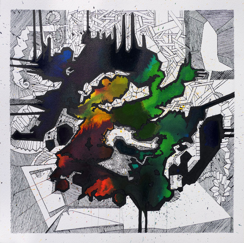 42 x 42 cm (Bild), 46 x 46 cm (Blatt), 12. März 2026, Tuschezeichnung, Aquarellpapier 300g/m2, Kosmos Atlas Kartensammlung – EKASS 10 – Eigenkontextuelle Architektur-Symbol-Sequenzen